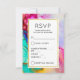 Um cartão RSVP de casamento com um desenho abstrato artístico rico. Pintura aquosa com as cores misturando e misturando criando um padrão fluido agradável. Um quadro branco com uma borda falsa de folha de ouro colocada sobre cima com seu dentro de texto personalizado.