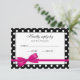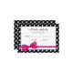 Um padrão de bolinhas preto na moda com uma ilustração de fita rosa é apresentado nesta placa de resposta RSVP. Personalize facilmente suas informações.