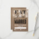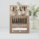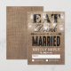 Esses cartões de RSVP de casamento country caprichosos vêm como um conjunto de casamento correspondente com um efeito de fundo de burlap marrom rústico, luzes cintilantes de cordão de jarro de mason elegantes, as palavras "COMA, BEBE E CASE" e os detalhes da sua resposta de casamento.