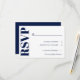 Cartão RSVP de casamento de tipografia elegante em tons de azul e branco marinho.