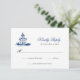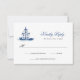 Cartão rsvp de casamento da igreja com ilustração aquosa de uma igreja azul e branca.