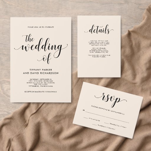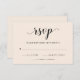 Estas modernas cartas de RSVP de casamento apresentam um fundo cor-de-rosa pincelado e uma tenda tipografia negra.