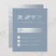 Um RSVP de orçamento elegante para um casamento... com cores de casamento azuis e prateadas. O fundo é azul empoeirado. O título RSVP é folha de prata falsa, o resto do texto é cinza prateada, exceto a letra M, que é azul empoeirado. O título RSVP e a letra M são escritos num guião caligráfico elegante, o resto em bonés. A caixa retangular do nome, as pequenas caixas quadradas e o dorso são folhas de prata falsas.