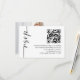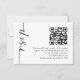 RSVP de Casamento de Código QR de Foto de Caligrafia Minimalista, para associar seus convites, RSVP está em uma caligrafia elegante definida rodada e à esquerda, com sua mensagem à direita. Personalize facilmente o resto do texto para os seus próprios detalhes e substitua o código QR de amostra pelo seu próprio código simplesmente alterando o URL de amostra pelo seu próprio que será gerado automaticamente. Substitua a imagem de amostra no verso pela sua.