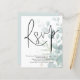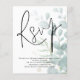 RSVP de Casamento de Código QR do Script Eucalyptus de Orçamento. Um alternativo de 4,5 pol x 5,6 pol com preço inferior. Disponível em um STOCK DE CARTÃO SEMI-GLOSS 110 lb, que é a opção padrão (mais espesso para convites), OU um STOCK de PAPEL THINNER FINISH 80 lb FINISH (ideal para gabinetes). Adicione seu código QR à sua página de resposta no site do casamento no verso substituindo o código QR na amostra. Você pode criar códigos QR gratuitamente on-line. Basta pesquisar "Criador de código QR" e muitas opções surgem para criar gratuitamente. Uma tipografia de na moda set em preto para o título principal RSVP complementando o resto do texto que você pode personalizar facilmente. As folhas de eucalipto azuis são pintadas ao fundo com o texto parcialmente sobreposto. Um fundo azul em pó de coordenação também está no verso.