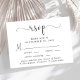 Cartão RSVP de casamento elegante com "rsvp" em um roteiro de caligrafia com baloiços, simples tipografia moderna, suas opções personalizadas de entrada de menus e seus nomes juntos por um coração no verso.