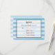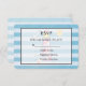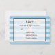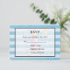 Um cartão RSVP de casamento com um tema náutico. Projetado com um padrão listrado azul e um quadro semitransparente com uma borda preta colocada sobre o topo. Um farol vermelho listrado e uma bola de praia, e um sol sorridente e uma gaivota à distância desvaneceram-se ao fundo.