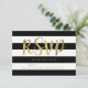 Convidado de casamento moderno RSVP responder / cartões de resposta com fundo listrado preto e branco com fonte RSVP de efeito de folha de ouro.