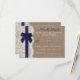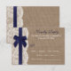 A design apresenta um adorável fundo de efeito de burlap rustico com uma trim romântica de efeito de renda branca vintage terminada com uma fita marinho impressionante com arco. Essas cartas de RSVP podem ser personalizadas para sua ocasião especial e farão o anúncio perfeito para qualquer casamento rústico, chá de panela, festa de noivado, festa de aniversário e muito, muito mais. *Observe que a Zazzle só vende produtos impressos para que essas placas RSVP não tenham nenhum material real de burlap, renda, arco ou fita.