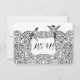 Hummingbird Bird Wedding RSVP Inserir Cartão de Resposta. Preto e Design branco, manuscrito de informação preto que deixa o padrão de insígnia negra acompanhado por um pássaro amoroso sentado em um galho suave sobre um pano de fundo intrincado e adorável com dois pássaros amorosos românticos adorando um ao outro. Casamentos de Aves Vintage e Ocasiões Especiais talvez parecidos com Designs de Brida Mehndi. Esta Coleção de Casamentos de Pássaros é perfeita para aquele Casamento Único de Pássaros de Amor. Com a quantidade certa de esperteza e perfeitamente elegante com um conto de fadas, sinto/ Perfeito para aquele romântico capricho de um casamento único. Doce romântico e cheio de capricho.
