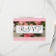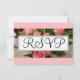 RSVP de Casamento escrito em elegante script preto dentro geométrico branco e quadro colorido prata contra buquê rosa rosa rosa rosa rosa. Fundo cor-de-rosa com rosa suave. Adorável para um primavera, casamento de verão. Personalize o verso em cor dourada e o texto preto em fundo branco nítido. Fotografia original e Design por TamiraZDesign.