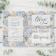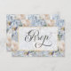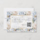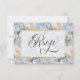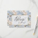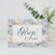 Este design de cartão de resposta do casamento apresenta um lindo padrão floral azul e branco rústico e macio em um fundo empoeirado azul-piscadela. O texto é exibido em uma área de texto transparente branca suave com um quadro de brilho dourado sujo. a parte de trás continua o padrão floral. Este cartão faz parte da suíte de casamento Blue & White Rustic Floral Dourado Frame, criada pela Simply Farmhouse Press.