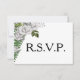 Um brilhante, elegante RSVP floral verde e branco com um bonito buquê de rosas brancas e frondes de samambaia no canto. Esta elegante placa RSVP foi especialmente criada para corresponder a um convite semelhante que você pode encontrar aqui: https://www.zazzle.com/collections/white_roses_and_ferns_wedding-119786263350020321