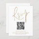 Um valor para o alternativo do ORÇAMENTO em tamanho menor de 4,5 x 5,6" de semirbrilho de 110 lbs, que é de espessura semelhante a um cartão postal (no entanto, não é adequado para uso como cartão postal). POR FAVOR, OBSERVE QUE HÁ UM convite por folha. RSVP de Casamento de Script Dourado de Código QR de Orçamento Um gabinete de opções conveniente para pedir aos seus convidados que digitalizem o seu código QR para o seu site de casamento para RSVP. Uma tipografia na moda em ouro para o título principal RSVP complementando o resto do texto que você pode personalizar facilmente.