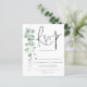 Um valor para o alternativo do ORÇAMENTO em tamanho menor de 4,5 x 5,6" de semirbrilho de 110 lbs, que é de espessura semelhante a um cartão postal (no entanto, não é adequado para uso como cartão postal). POR FAVOR, NOTE que existe UM por folha. RSVP de Casamento de QR do Script Eucalyptus de Orçamento. Folhagem de aquarela elegante está do lado esquerdo. O RSVP está em um script de na moda e personaliza facilmente o resto das palavras.