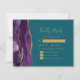 A borda esquerda deste elegante cartão de cercado RSVP de casamento moderno apresenta uma borda de agitação de cor d'água roxa, aparada com falso brilho dourado. O título "Resposta gentil" aparece em um script de escrita manuscrita dourado, com o texto restante em fontes copperplate e itálico em um fundo azul lacrimogêneo. Inclui espaços para seus convidados iniciarem sua escolha de três entradas editáveis. O verso apresenta um design de agate roxo e dourado correspondente.