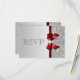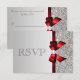 Elegante personalizado de cor prateada e vermelha RSVP eventos de casamento, chá de fraldas, festa de aniversário ou corporações modelo de placas planas com um lindo padrão de sequências prateadas, um doce arco de imagem impressa vermelha e fita e uma bonito joia de mistura de diamantes impressos. Esses modelos de cartões de resposta modernos, elegantes, sofisticados, contemporâneos, glamourosos, glamourosos são decorados de ambos os lados. Linda, chique, feminina, moda, convites. Por favor, note: todos os convites para o Zazzle têm imagens impressas em formato plano. O texto, a fonte e a cor da fonte podem ser personalizados. Se precisar de ajuda para personalizar seu produto, entre em contato comigo através da minha loja. Ficarei feliz em ajudar. Tenho produtos correspondentes na minha loja.