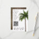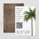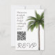 Palmeira, cartões de resposta de código QR de casamento com tema tropical. Uma palmeira alta se destaca sobre o fundo branco em placas verticais pequenas. Crie seu próprio código para adicionar ao modelo e torne simples para os convidados responder ao casamento, chás ou outros grandes eventos. Um pequeno parágrafo de texto pode ser adicionado à esquerda pedindo aos convidados que respondam até uma determinada data. A parte traseira da placa tem uma imagem de latido de palmeiras.