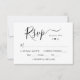 Placas RSVP de casamento Monograma preto e branco modernas e minimalistas apresentam um design tipográfico elegante com roteiro de caligrafia. Apresentando o monograma do casal com motivo cardíaco. Texto personalizado minimalista que pode ser personalizado com a data de vencimento do RSVP. O design inclui uma linha para o(s) nome(s) convidado(s), participação em eventos, escolha de refeições e o número total de convidados que participam.