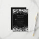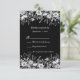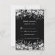 Um cartão de resposta de casamento preto e branco divertido em um fundo preto e texto de cinza leve. Uma borda floral branca e preta fecha a parte superior e inferior deste convite. Esta é parte de um pacote com produtos correspondentes.