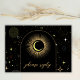 Cartão de resposta ao casamento místico celestial personalizado, com quadro de arco, céu de meia-noite galáxia com poeira estrela, lua crescente e outros símbolos astrológicos em cores pretas e ouros. Este cartão é facilmente editável. Se precisar de ajuda para a personalização desta placa ou se precisar de mais produtos correspondentes para esta coleção, envie-me gentilmente através do Zazzle.