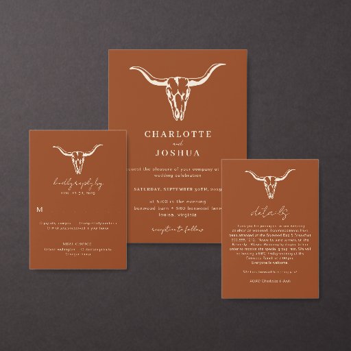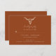 Simples Cartão RSVP de Casamento Russo de Cabeça de Vaca - Um simples cartão de resposta de casamento coordenado com a tipografia moderna e escrita para um sentimento minimalista. O cartão de resposta apresenta um crânio de vaca, ao estilo do cowboy, em creme de sobremesa, em fundo de ferrugem. A placa RSVP faz parte de uma coleção e todos os elementos e cores podem ser facilmente alterados para se coordenar com o seu casamento ocidental. O cartão de resposta inclui a escolha da refeição.
