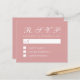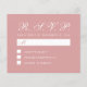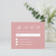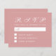 Um simples e minimalista representante de orçamento para um casamento. Tem apenas texto branco sobre fundo cor-de-rosa rosa empoeirado. O título RSVP e a letra M são escritos num guião caligráfico elegante, o resto em bonés.