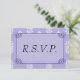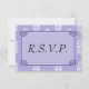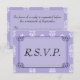 Um anúncio muito elegante e personalizado de RSVP de casamento em violeta / azul, parte do conjunto correspondente de papelaria de casamento 'Violet Blue Damask' com cor damasco azul e branca lavanda com ornamentos decorativos azuis.
