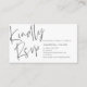 Apresentando nossa placa RSVP de Casamento de Elegância Moderna - a combinação perfeita de sofisticação e simplicidade. Projetada para o casal contemporâneo, esta placa RSVP apresenta um roteiro limpo e minimalista e um toque sutil de luxo para confirmar a presença de seus convidados. A design elegante complementa o tema do casamento das cinzas escuras, adicionando um toque de classe à sua suíte de papelaria. Assegure-se de que seu dia especial seja meticulosamente planejado com nosso elegante cartão RSVP moderno - um eterno de manutenção para você e seus convidados. Projetado por TeeshaDerrick