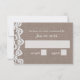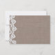 O país rústico parece uma burlap escura e uma renda branca de crochê antiga e vintage. Cartão de resposta para complementar convites de correspondência, todas as partes deste convite são impressas, não há nenhuma burlap ou local real anexado.