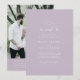 Este convite para casamento de fotos roxas com o RSVP é perfeito para um casamento simples. A design moderna minimalista apresenta a lavanda púrpura e romântica do pastel eterno com estilo de conto de fadas boêmico, perfeito para um casamento de primavera ou jardim de verão. Personalize seus convites de casamento com as primeiras iniciais do casal na frente, e uma imagem de noivado e um código QR para detalhes e RSVPing na parte traseira do cartão.