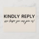 No texto editável, a palavra "gentilmente resposta" foi colocada, grande e negrito, na frente. Numa letra casual moderna, aparece abaixo um gráfico que mostra "esperamos que nos possamos juntar!". No verso, a mesma fonte exclusiva foi usada para criar gráficos que leram "rsvp", "m", "gentilmente entregar para:" e "opção de menu para cada convidado:" Todo o outro texto é editável. Use os campos modelo para personalizar o máximo que você desejar. O plano de fundo pode ser alterado para qualquer cor que lhe convém. 100 //