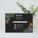 Cartão mexicano de RSVP Fiesta colorido com flores de arte folk contra um fundo preto dramático (você pode mudar a cor para se adequar ao seu gosto). Excelente para casamentos de destino no México, casamentos Cinco de Mayo, ou para alguém que ama a cultura mexicana. Parte da nossa coleção de Flores Mexicanas.