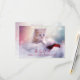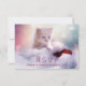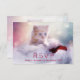 Um cartão RSVP com uma fotografia de um gatinho gengibre sentado sobre um chapéu de Papai Noel branco e vermelho. Luzes brilhantes turvas nos fundos.