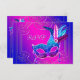 Belo mascarada azul-real, cor-de-rosa-quente, RSVP com bonito azul-lacrimejante, rosa-quente e máscara de penas azul-real em um lindo fundo roxo e rosa-quente. Este elegante RSVP de mascarada roxo, cor-de-rosa-quente, é facilmente personalizado para o seu evento simplesmente adicionando detalhes do seu evento, estilo de fonte, tamanho e cor de fonte e texto. Esta é uma design impressa sem brilho real, penas, joias, etc.