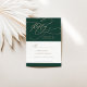 Este pedido romântico de música de caligrafia verde RSVP é perfeito para um casamento simples. O clássico moderno design apresenta espirais de rico e turbilhões brancos com belíssima e elegante tipografia de folha de ouro de champanhe com letra falsa. Crie sua lista de convidados de casamento e sua lista de músicas de dança de uma só vez! Este cartão de resposta do casamento convenientemente pergunta aos hóspedes se eles serão capazes de ir ao seu casamento, e também que música os fará dançar. Nota: Este design não apresenta folha de ouro real. É um gráfico de alta qualidade feito para se parecer com folhas de ouro.