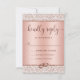 Esta rosa de design de RSVP de ouro de tendência corresponde aos convites para casamentos tema damasco metálicos. O amortecedor rosa dourado sobre a parte superior e inferior é acentuado com anéis de casamento, e enquadra a tipografia do roteiro. O monograma da noiva e do noivo está no verso em uma elegante fonte limpa de script. **Não existe ouro rosa, tinta metálica ou brilho neste item. São simulados os detalhes do ouro e da brilha do rosa.