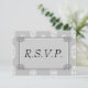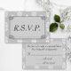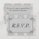 Um anúncio muito elegante de RSVP de casamento em cinza e prata, com cinza e cor damasco branca, ornamentos de prata.