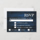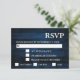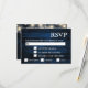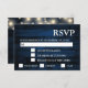 Cartão RSVP de casamento russo com um fundo azul de madeira marinho com luzes de cordas. A data para RSVP por tem uma caixa de texto rotulada para ajudá-lo a personalizá-la para seu dia.