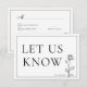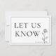 Este cartão RSVP da coleção de artigos de casamento "Eterno Bloom"** foi projetado com um formato quadrado moderno que equilibra elegância com praticidade. Na frente, a legenda "LET US KNOW" é mostrada elegantemente no topo em uma fonte sofisticada, seguida da data RSVP em um roteiro refinado abaixo. O trabalho de arte de rosa de linha de solteiro é belamente colocado no fundo, adicionando um toque artístico que se alinha ao tema do eterno da coleção. No verso, as opções de RSVP são apresentadas claramente para os convidados. Podem indicar a sua resposta selecionando "Aceitar com Prazer" ou "Recusar Lamentavelmente". Abaixo disso, há espaço para o número de convidados presentes, junto com uma seção para registrar alergias à comida ou restrições dietéticas. Além disso, há três opções de menu fornecidas para os convidados selecionarem sua opção de refeição preferida, garantindo uma experiência perfeita de jantar. Esse detalhe ponderado substitui a opção de solicitação de música, oferecendo personalização prática para as necessidades do casal. O design integra elegância estética e funcionalidade, fazer esta placa RSVP é um complemento perfeito para a coleção "Eterno Bloom"