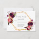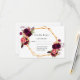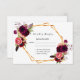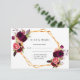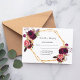 Um cartão RSVP elegante com modelos para resposta por data, nome etc. Penas e rosas de cor aquosa, flores em burgundy. Um falso quadro de ouro e branco. Um fundo branco na frente, texto preto.