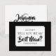 Todo noivo precisa de seu melhor amigo ao seu lado no dia do casamento. Peça-lhe que seja o seu melhor homem com este cartão de apresentação divertida. Apresenta texto preto de script em negrito com um padrão quadrado branco geométrico sobre um fundo preto. O verso tem um lugar para inserir uma mensagem especial.