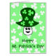 Um cogumelo cartoon com uma tampa verde em forma de chapéu de duende. O boné tem manchas de shamrock. O caule branco tem um rosto feliz, porque todos os fungos adoram celebrações. O fundo é verde-claro com um padrão de shamrock branco. Na frente do cartão lê-se "Feliz Rua. Dia de Patrick" e o dentro diz "Que a sorte dos cogumelos esteja com você!"