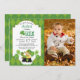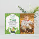 Rua, convite de aniversário do tema irlandês do Dia do Patrick para o menino ou a menina. Convide apresenta um padrão de diamante verde, um duende de Dia de São Patrício a saltar no pote de ouro, balões de shamrock e a foto do seu filho. Fácil de personalizar com opções personalizadas.