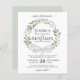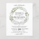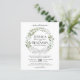 Estes belos convites de casamento são a escolha perfeita para a elegância rústica num orçamento. O design pintado manualmente apresenta uma coroa de folhas de eucalipto e verde de jardim com arco de cetim branco. Barato e barato, esses convites combinam estilo bóho com classe e sofisticação.
