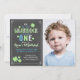 Tendy Chalkboard Shamrock design para qualquer Rua de primeiro aniversario de qualquer garoto. Modelo apresenta um design de quadro com texto colorido. Nota: Nosso Pequeno Shamrock está transformando UM NÃO É EDITÁVEL. O resto do texto pode ser editado para os detalhes do seu partido. A foto pode ser trocada por você. O verso do convite apresenta um padrão de shamrock de giz mole.