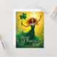Uma mulher alegre e cabeleira em um elegante cheio verde de joie de vivre diante de um brilhante e ouro fundo amarelo. Ela está segurando um grande trevo de quatro folhas em sua mão, enquanto pequenos trevos flutuam no ar ao seu redor. A cena irradia energia, felicidade e celebrações, ajustando-se às Ruas. Dia de Patrick.