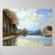 Vista do Canal Santo-Martin em Paris. Alfred Sisley. Paisagem primavera em tons azuis. Rio fluido pelo cheio. Há uma cidade na margem do rio. Árvores crescem no aterro. Nuvens leves estão correndo pelo céu. Reprodução de famosas imagens de arte no dominio público.