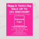 Folheto cor-de-rosa para Ruas. Dia de Patrick que você pode personalizar especificando a porcentagem de desconto, datas de venda, fazendo upload do logotipo de sua empresa, digitando seu nome de empresa, endereço, número de telefone, email e site. Personalize-o e distribua-o para atrair mais clientes para comprar seus produtos ou clientes para gostar de seus serviços. Verifique a aparência dos lados frontal e traseiro após carregar o logotipo e os textos de digitação. Se a aparência lhe agrada, você pode colocar seu pedido agora. Se precisar redimensionar e reposicionar o logotipo e as mensagens em ajustado neste folheto ou no tamanho que você escolheu, ajuste na ferramenta design. Você também pode alterar a cor do plano de fundo, a cor da fonte e o estilo da fonte na ferramenta design. Feliz Rua, Dia de Patrick! Desejando-lhe o melhor de sorte, alegria e mais vendas neste feriado.