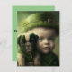 Uma Rua Feliz. Cartão do Dia de Patrick com um menino e seu cachorro. Esta é uma placa plana. A parte de trás é verde e diz: Ruas felizes. Dia de Patrick.